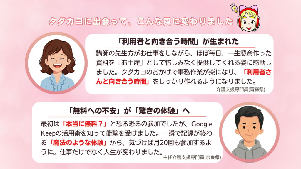 タダカヨとの出会いで、多くの方が喜びや成果を実感いただいています。