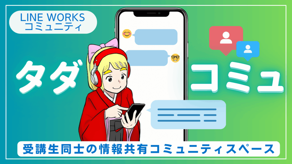 無料のオンラインPCスクールタダスクが提供する、受講生同士が情報を共有し、学びを深めるためのLINE WORKSを使ったコミュニティスペースです。